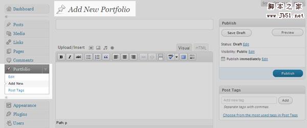 一個全新的功能! 目前,WordPress用戶只能在后臺添加新日志和新頁面。 但在WP 3.0中,用戶們可以給自己的網站添加新的文章類型。 例如,你可以利用下面的代碼添加一個名為“Portfolio(作品集)”的新文章類型: