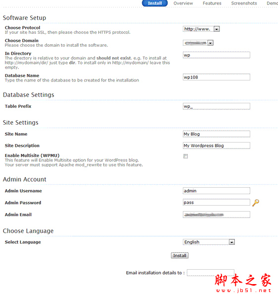 最后,填寫完畢后,我們點擊下面的”INSTALL”按鈕就可以完成,然后我們根據自己的需要,登陸WP站后臺修改信息,然后布局等等。總結,我們要習慣使用工具,這樣可以快速建站,省的我們需要一步步FTP上傳,以及添加數據庫等工作。網絡本來就是一個效率工作。