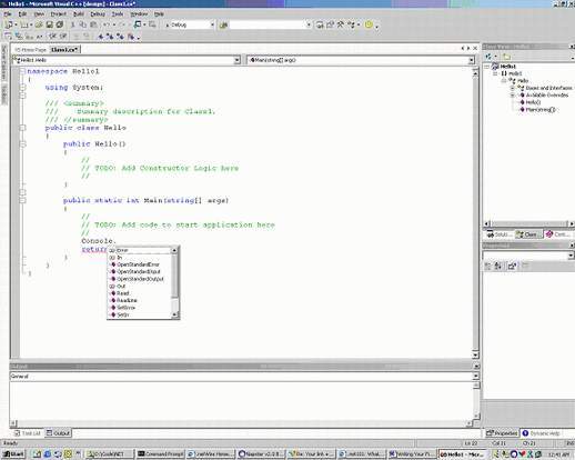 現(xiàn)在我們要增加一些代碼來執(zhí)行一些有用的操作。第一件事是將右上角的窗口切換到Class View(類視圖),然后展開"Hello1" 名稱空間,點(diǎn)擊 "Class1" 類。在屬性窗口中將名稱修改為Hello。現(xiàn)在的代碼窗口變?yōu)椋?/TD> |
