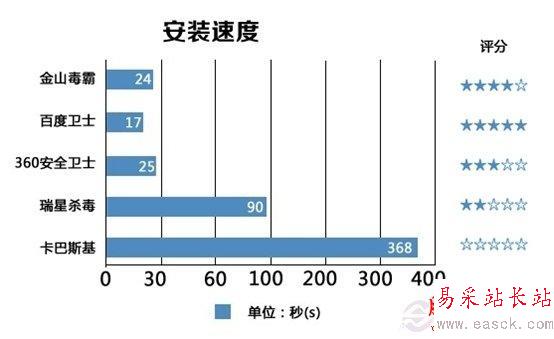 安裝速度在實際使用中影響體驗并不明顯,在本次測試中除卡巴斯基、瑞星殺毒之外其他三家都表現非常好。