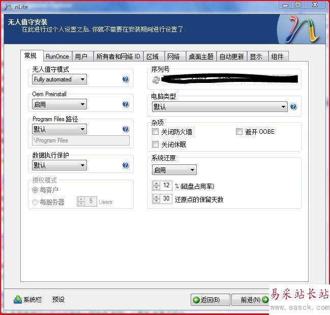 常規:無人值守模式:選擇完全安裝,其他可以保持默認(可以更具自己需求設置),序列號:在這里填入后,安裝的時候就不需要手動輸入序列號了。