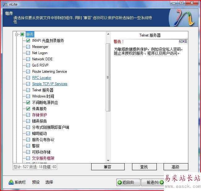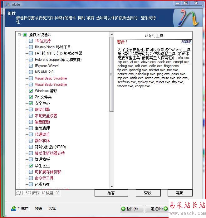 組件:在這里可以定義你需要安裝的組建,可以去掉不需要的組件,每個組件干什么的在右邊都有說明的,只要選中不需要的組件就可以了,注意用紅色顯示的不要選中。
