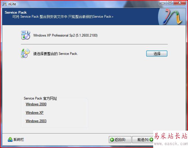 Service Pack:你可以把最新的SP整合到這個光盤里來。我這里已經是SP2 了所以就不需要整合了。點擊前進