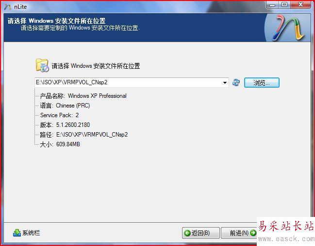 點擊前進,進入到下一個頁面,在這里選擇windows 安裝文件的所在位置,注意如果你是使用ISO文件的話,要用虛擬光驅打開,或者用WinRAR解壓出來。點擊前進,接下來他會檢測你當前windows安裝文件的基本信息。