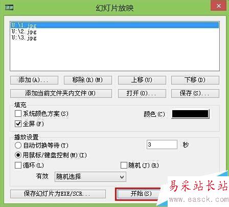 4、在彈出的幻燈片放映窗口中,點擊“開始(S)”進入圖片播放界面。如下圖所示
