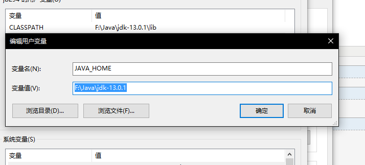 JAVA_HOME:F:/Java/jdk-13.0.1 (安裝目錄)