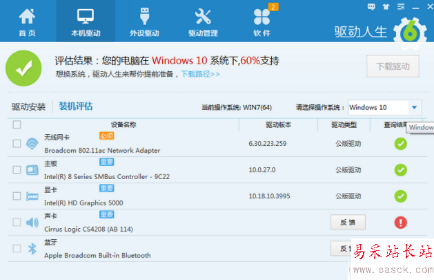 若低于80%,如下圖所在的電腦只有60%支持Win10。此時要怎么辦呢?聲卡驅動和藍牙驅動有感嘆號,這說明該臺電腦的聲卡和藍牙服務商還沒有發布Win10驅動。這種情況下,該電腦依然可以升級到Win10,只不過升級之后,需要進一步用驅動人生進行操作。