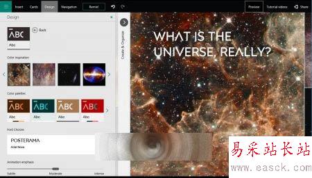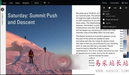 “認識表達思想的全新方式。 Sway是一款數字故事分享應用,適合公司、學校和家庭使用,使你能夠快速而輕松地創建和共享精美的交互式報表、演示文稿、個人故事等。 請添加你的內容,其他的交給我們。”