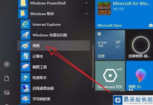 1、在Windows10系統桌面,我們依次點擊“開始/Windows附件/畫圖”菜單項。