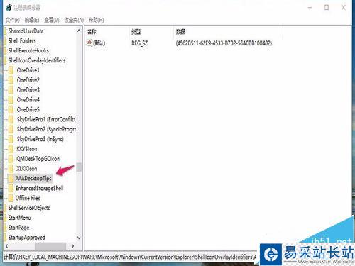 5、找到到達最終位置HKEY_LOCAL_MACHINE/SOFTWARE/Microsoft/Windows/CurrentVersion/Explorer/ShellIconOverlayIdentifiers/AAADesktopTips,然后刪除此文件夾及注冊表項(特別是這個注冊項{4562B511-62E9-4533-B7B2-56A8BB10B482}必須刪除)