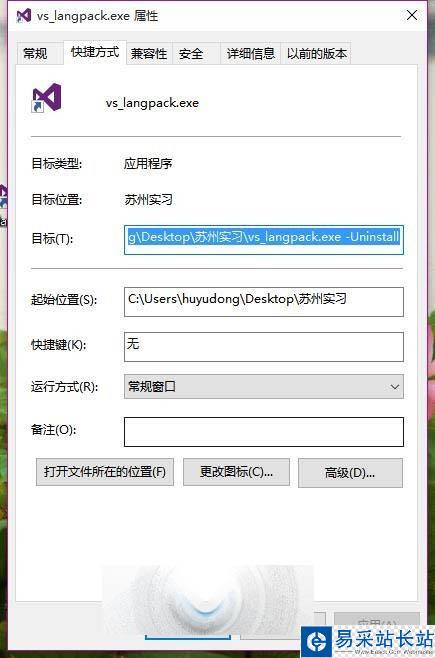 之后右鍵單擊快捷方式,選擇屬性,并在目標一欄最后添加文本 -Uninstall,然后確定即可。