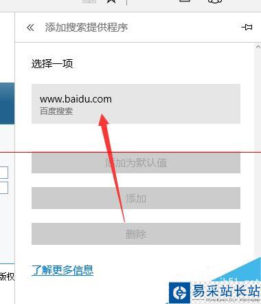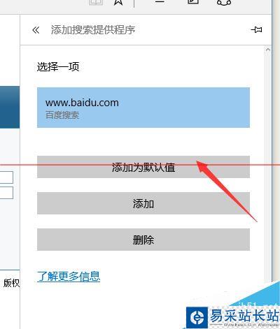 4、然后點(diǎn)擊百度,并選擇“添加為默認(rèn)項(xiàng)”。