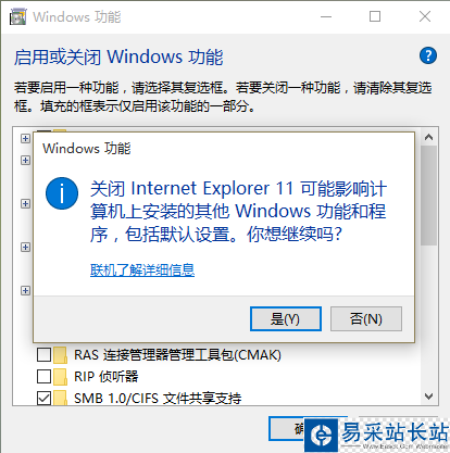 此時(shí)系統(tǒng)會(huì)彈出一個(gè)通知窗口,告訴你“關(guān)閉 Internet Explorer 11 可能會(huì)影響計(jì)算機(jī)上安裝其他 Windows 的功能或程序,包括默認(rèn)設(shè)置。”