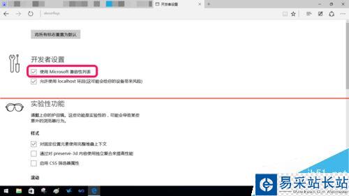 3、接下來,可以看到一些瀏覽器隱藏的設置選項。在“開發者選項”中,去掉那個“使用Microsoft兼容性列表”。