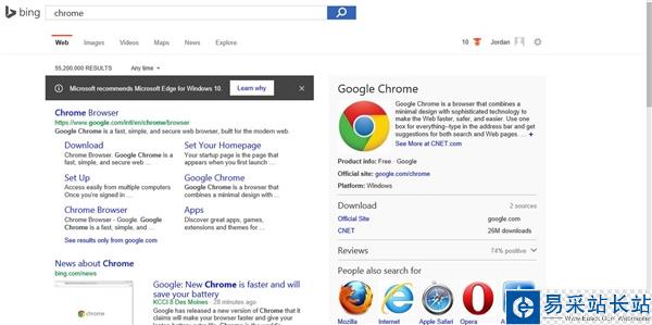 當(dāng)用戶使用默認搜索引擎Bing來搜索Chrome或者Firefox(火狐)時會出現(xiàn)一個提示按鈕“微軟建議在Windows 10中使用Edge瀏覽器”,點開按鈕則會跳轉(zhuǎn)至一個介紹Edge瀏覽器新特性的頁面。對此,業(yè)內(nèi)人士認為微軟對于自家新產(chǎn)品的宣傳已經(jīng)無所不用其極,不過這依舊無法彌補Edge瀏覽器在一些功能上的短板,比如插件擴展。
