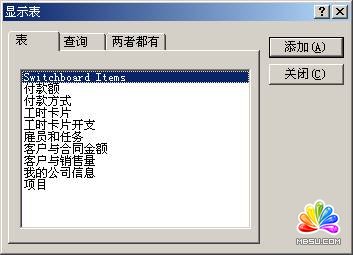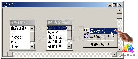 如果需要添加的關(guān)系表沒有在“關(guān)系”對話框中列出,那么就需要進入“顯示表”對話框,為此可以右擊“關(guān)系”對話框中任意處,然后從一份快捷菜單中選擇“顯示表”命令,參圖41。接下來就可以在這個對話框的“表”選項卡中選擇要加入的表,然后單擊“添加”按鈕。下面的操作將使用“雇員和任務”、“客戶與銷售量”、“客戶與合同金額”這三張數(shù)據(jù)表,它們?nèi)际窃诖酥敖⒌模斎氲臄?shù)據(jù)記錄也很簡單,各字段如圖42所示,您可以自己建立好。