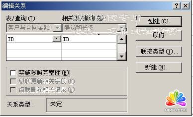 接下來,您可以參照這幾步操作對每一張要建立關(guān)聯(lián)的表進行操作。本章例所使用的主鍵是ID字段,所以操作的結(jié)果將如圖44所示。在該插圖中,各表中的ID字段使用了一條折線與另一張的相同字段相連接,這是Access2000關(guān)聯(lián)關(guān)系的方法。此后,關(guān)閉“關(guān)系”窗口時,屏幕上還將顯示提示詢問是否要保存此布局配置。不論是否保存此配置,所創(chuàng)建的關(guān)系都已保存在當前數(shù)據(jù)庫中。