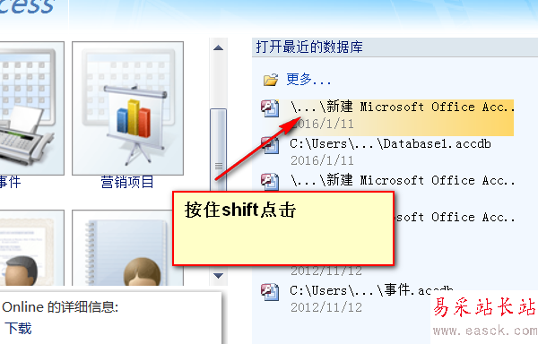 4、打開access2007,關(guān)掉當(dāng)前數(shù)據(jù)庫(kù),可以在畫面右上角看到最近打開的數(shù)據(jù)庫(kù),按住shift鍵,然后點(diǎn)擊剛才設(shè)置的數(shù)據(jù)庫(kù)。