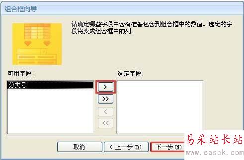 5、在打開(kāi)的界面中列出了圖書(shū)分類(lèi)表中的所有字段,這里選擇“可用字段”列表框中的“分類(lèi)號(hào)”項(xiàng),單擊“右尖括號(hào)”按鈕將所選字段選入,然后單擊“下一步”按鈕繼續(xù)。