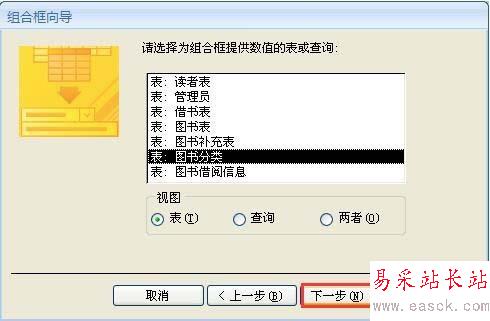 4、在打開(kāi)的界面中的“表或查詢(xún)”列表框中選擇要使用的源表,單擊“下一步”按鈕。