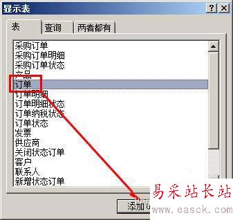 2、在彈出的顯示表對話框中,選擇訂單這個表,然后點擊添加