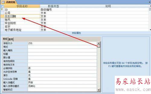 3、在設計視圖中,我們找到出生日期,我們的目的就是給出生日期設置一個輸入掩碼。點擊出生日期,這樣就選中它了。