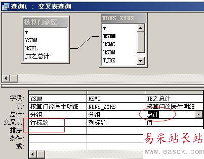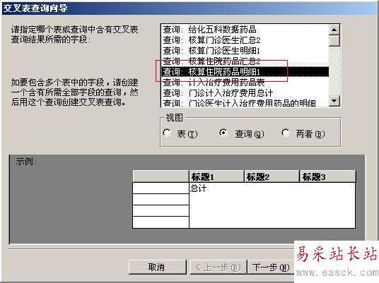 三、連接好表之后,點擊菜單欄的查詢--交叉表查詢。就可以出現(xiàn)交叉表界面。這里我們要理解行標題、列標題和交叉值。