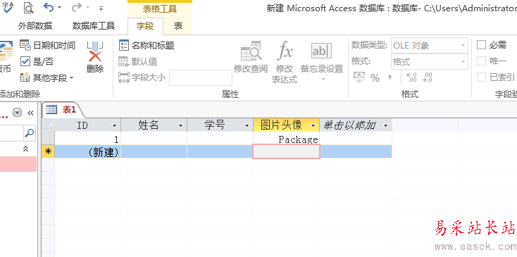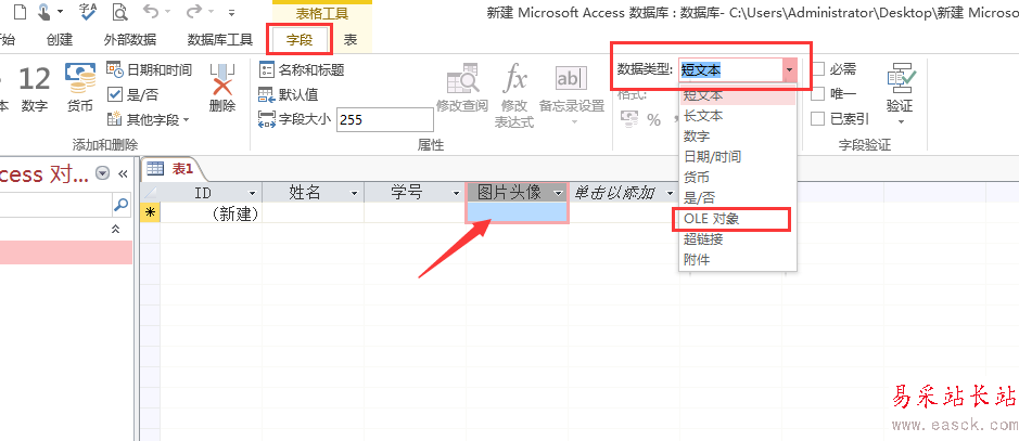 4、要想在單元格中插入圖片,我們必須這個圖片的字段類型設置為OLE對象,選中這個字段,切換到字段選項卡,在數據類型中選擇【OLE對象】