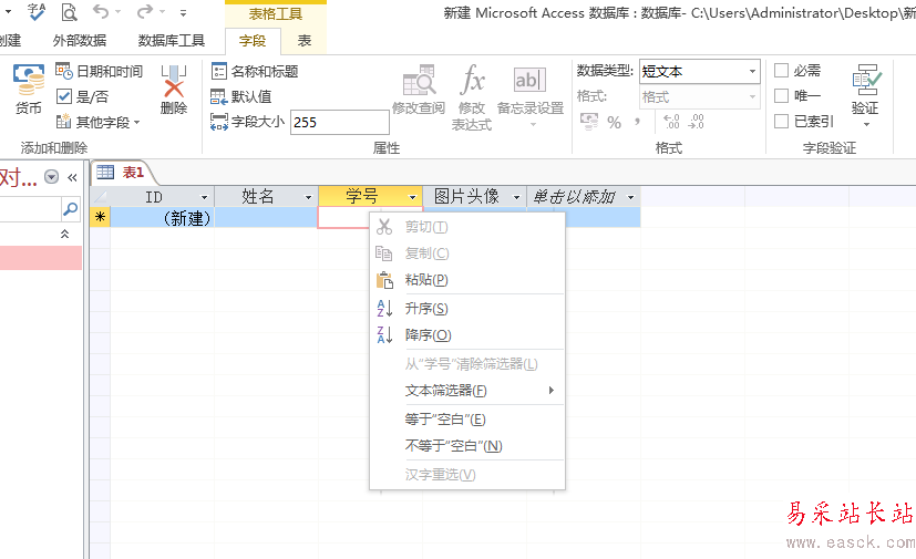 3、點擊表頭位,添加必須的字段,第1列為ID,默認不能更改,可以按需要設定字段的類型,如姓名,字段類型設為文本型