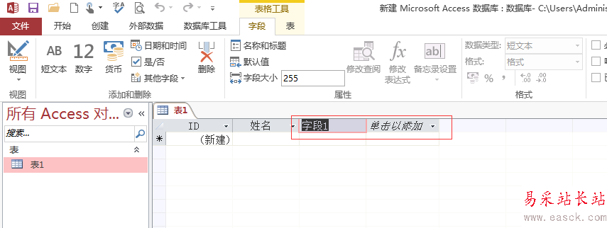 2、打開這個數據庫,切換到創建,點擊表,創一個表,需要的可以進行一下重命名,這里直接以表1作為命名