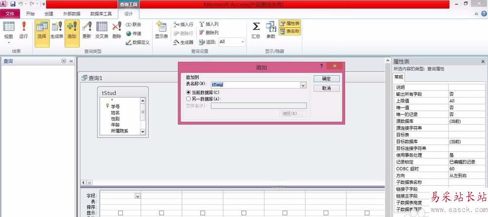 4、單擊【查詢類型】分組中的“追加”按鈕,在追加表對話框內輸追加到表名稱“tTemp”,單擊“確定”按鈕關閉對話框。
