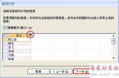 5、跳轉字段格式,可將光標置于字段單元格右側,待變為十字形時拖動鼠標設置字段寬度,然后單擊“下一步”按鈕。