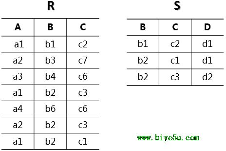 關系R和關系S具有相同的目n(屬性個數),且相應的屬性取自同一個域,則R與S的交運算的結果是由既屬于R又屬于S的元組組成,即R與S中相同的元組,組成一個新關系,其結果仍為n目關系。記作: