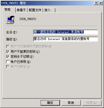 在彈出的“新用戶”對話框中根據實際需要輸入“用戶名”、“全名”、“描述”、“密碼”、“確認密碼”,并將“用戶下次登錄時須更改密碼” 前的對號去掉,選中“用戶不能更改密碼”和“密碼永不過期”。本例是給第一虛擬主機的用戶建立一個匿名訪問 Internet 信息服務的內置帳號“IUSR_VHOST1”,即:所有客戶端使用 http://xxx.xxx.xxxx/ 訪問此虛擬主機時,都是以這個身份來訪問的。輸入完成后點“創建”即可??梢愿鶕嶋H需要,創建多個用戶,創建完畢后點“關閉”: