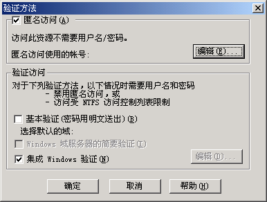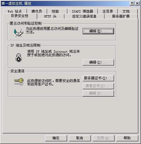 再切換到前面打開的“第一虛擬主機 屬性”的對話框,打開“目錄安全性”選項卡,點匿名訪問和驗證控制的“編輯”: