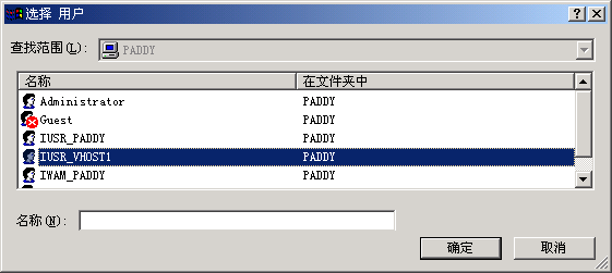 在“選擇 用戶”對話框中找到前面創建的新帳號“IUSR_VHOST1”,雙擊:
