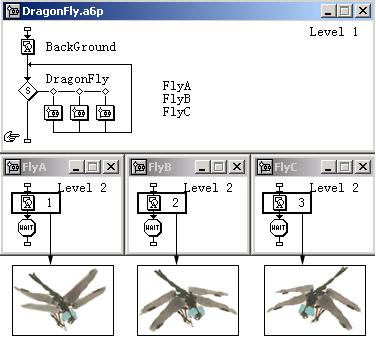 同理我們繼續(xù)設(shè)計其它兩幀的動畫"flyb"、"flyc"。最后的完整程序流程如圖6所示。此時按快捷鍵ctrl+r調(diào)試執(zhí)行,蜻蜓真的飛動起來了!