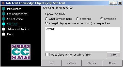 "select voice"步驟配置完畢后,單擊"next" 按鈕繼續(xù)進(jìn)入下一步的配置"set text"設(shè)置發(fā)聲的文本內(nèi)容,如圖7所示。這里我們選擇一個(gè)動(dòng)態(tài)改變的自定義變量"word"作為朗讀發(fā)聲內(nèi)容,因此選擇"a variable"選項(xiàng),并在其下的輸入框內(nèi)輸入=word即可,這樣在程序執(zhí)行過程中就會(huì)根據(jù)變量"word"的變化而自動(dòng)改變發(fā)聲內(nèi)容。
