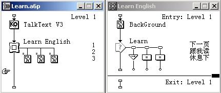 其它的流程設(shè)計(jì)主要是利用了框架圖標(biāo)的導(dǎo)航結(jié)構(gòu),如圖5右圖所示即為框架圖標(biāo)"learn english"的內(nèi)部流程,其中顯示圖標(biāo)"background"存放的是程序背景圖,而交互圖標(biāo)"learn"則是框架導(dǎo)航交互,其交互分支"下一頁"即為框架導(dǎo)航的"next"功能,兩個(gè)計(jì)算分支"跟我讀"和"休息下"的計(jì)算代碼分別如下所示: