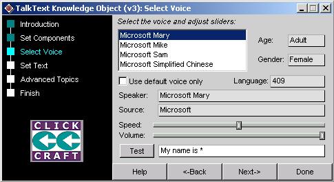 如果系統(tǒng)已經(jīng)安裝了sapi,則可以單擊"next" 按鈕繼續(xù)進(jìn)入下一步的配置"select voice"選擇發(fā)聲嗓音,如圖6所示。在此步驟里除了可以選擇發(fā)聲嗓音,即朗讀人物角色外,還可以設(shè)置朗讀速度及發(fā)聲音量大小,一般我們保持默認(rèn)值即可。
