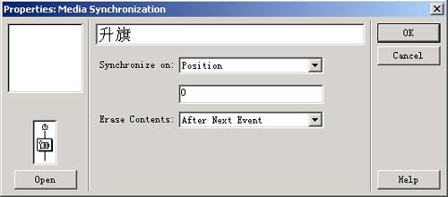 啟動(dòng)authorware 6.5后,新建一個(gè)redflag.a6p文件,建立如圖7所示的程序流程。其中插入的animated gif圖標(biāo)是一面迎風(fēng)飄揚(yáng)的國(guó)旗,至于媒體同步結(jié)構(gòu)"播放國(guó)旗"則是控制一邊播放國(guó)歌,一邊進(jìn)行升旗動(dòng)作,其音樂(lè)圖標(biāo)導(dǎo)入即是中華人民共和國(guó)國(guó)歌。媒體同步結(jié)構(gòu)"播放國(guó)旗"的屬性設(shè)置如圖8所示,其中“synchronize on”域選擇為"position"位置同步,而“erase contents”擦除域則選擇為"after next event"。