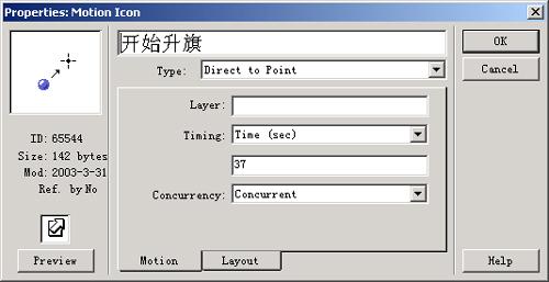 群組圖標(biāo)"升旗"的二級(jí)流程如圖7右圖所示,升旗動(dòng)作即是通過(guò)移動(dòng)圖標(biāo)"開(kāi)始升旗"移動(dòng)animated gif圖標(biāo)"國(guó)旗"來(lái)完成的,其屬性設(shè)置如圖9和圖10所示。“motion”選項(xiàng)卡中的“timing”域選擇為"time(sec)",速率設(shè)置為37;“concurrency”域選擇為"concurrent"即同步執(zhí)行方式。“l(fā)ayout”選項(xiàng)卡中設(shè)置的是具體的移動(dòng)目標(biāo)位置,這里我們選擇"direct to point"移動(dòng)方式,目標(biāo)位置(destination)當(dāng)然就是旗桿的頂部,因此我們?cè)O(shè)置目的地的x坐標(biāo)為"displayx@"國(guó)旗"",y坐標(biāo)為"displayy@"國(guó)旗"-280"即可。