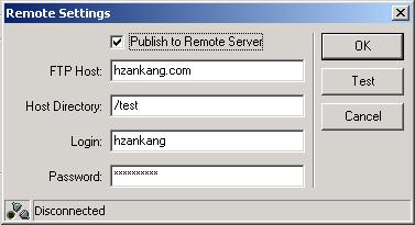 其實(shí)"一鍵發(fā)布"也支持直接把作品發(fā)布到ftp網(wǎng)絡(luò)服務(wù)器上,不知道大家有沒(méi)有發(fā)現(xiàn)“publish”按鈕的正下方有一個(gè)“remote”按鈕,點(diǎn)擊進(jìn)入將出現(xiàn)如圖6所示的對(duì)話框。把網(wǎng)絡(luò)服務(wù)器主機(jī)的相關(guān)登陸信息填寫完畢后,在發(fā)布時(shí),系統(tǒng)就會(huì)自動(dòng)把文件上傳到設(shè)置的主機(jī)上,無(wú)須通過(guò)第三方的ftp上傳工具。