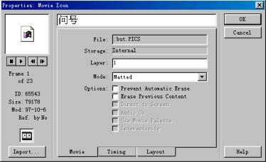 (2) 雙擊打開該設計按鈕的【movie】對話框,如圖10-3所示。單擊該對話框中的【import】命令按鈕彈出【import file】對話框來引入【數字化電影】文件。