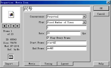 在控制數字化電影或聲音等媒體信息時,我們可以在其屬性對話框中輸入變量來控制該媒體的播放。例如在本實例中,我們在起始幀和終止幀正文輸入框中都輸入一個變量,這樣,通過對變量值的控制,我們就可以實現對媒體信息播放方式的控制。這樣,最終用戶可以在程序的執行過程中實現對媒體播放控制的改變。