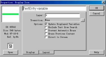 (2) 在該對話框中,我們設置該設計按鈕中顯示的對象在展示窗口中為第4層。選擇【update displayed variables】選項,在展示窗口實時更新變量的內容。