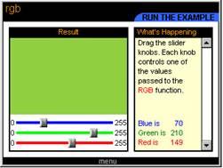 及時點評 rgb函數的色彩調配值是由3個滑塊在標尺上的位置值所決定的。因此,移動滑塊可使rgb函數合成不同的顏色。
