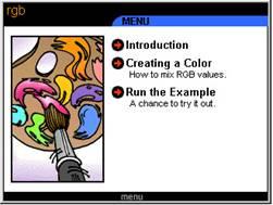 畫面左側窗口下沿有3個標尺,標尺計量范圍均為0~255,每個標尺上有一個可移動的滑塊,用鼠標拖動每個滑塊左右移動,窗口右側對應的顏色值也隨之改變,同時標尺上的矩形區域顏色也實時改變。填充矩形的顏色是由3個滑塊所在位置值所對應紅、綠、藍顏色配制而成的。