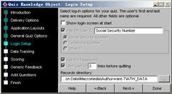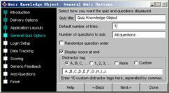 “general quiz options”這一步主要是進行練習(xí)測試題的常規(guī)設(shè)置,包括知識對象的圖標(biāo)名稱、允許嘗試答題次數(shù),出題方式(隨機)、題號格式、是否顯示統(tǒng)計總分等選項,如圖6-3所示。這里我們設(shè)置“default number of tries”為1,即每題只有一次回答機會,同時勾選“display score at end”選項讓系統(tǒng)在完成答題后顯示最后總得分,其他選項保持默認即可。確定后單擊【next】按鈕進入下一步——“l(fā)ogin setup”。
