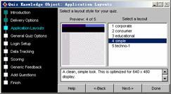 “application layouts”這一步主要是讓您選擇作品的界面風(fēng)格,它提供了5套漂亮的界面,您可根據(jù)個人喜好隨意選擇,如圖6-2所示。我們選擇第4個“simple”吧,簡單明了!確定后單擊【next】按鈕進入下一步——“general quiz options”。